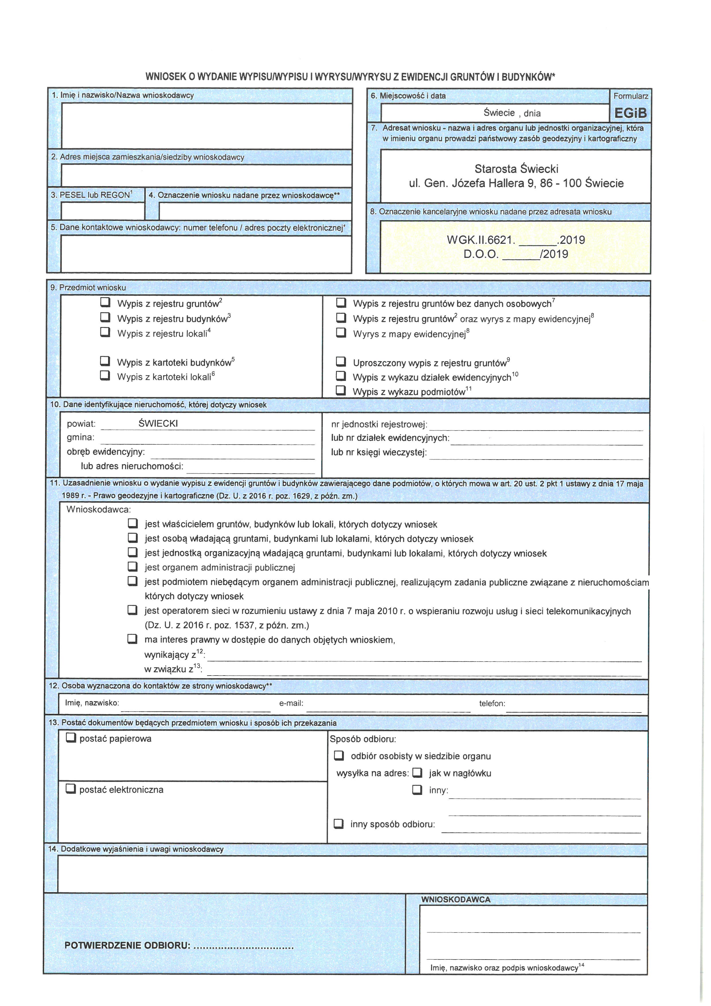 • Wymagane dokumenty Wniosek o wydanie wypisu/ wypisu i wyrysu/ wyrysu (Formularz EGiB)