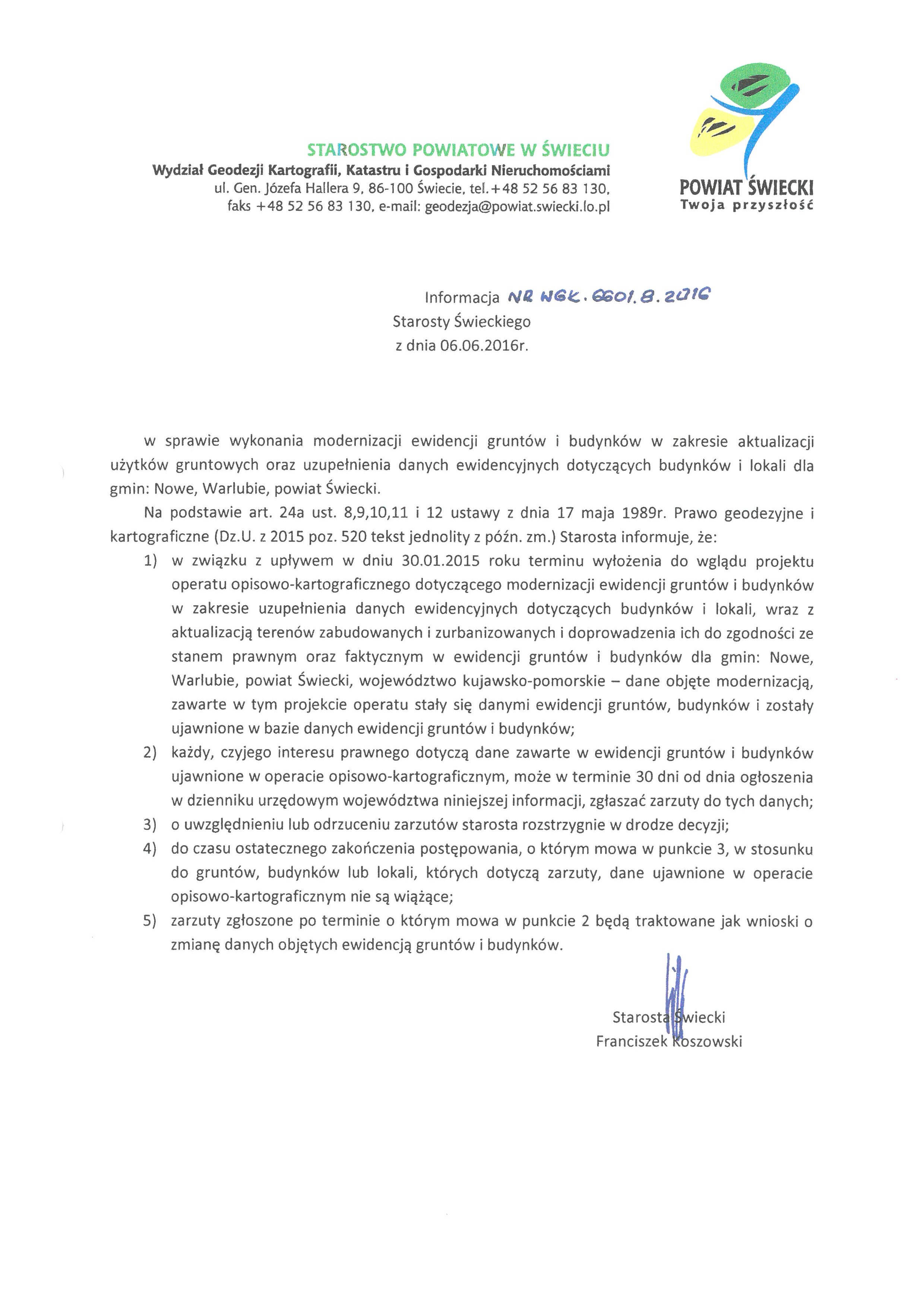 - w związku z upływem w dniu 30.01.2015 roku terminu wyłożenia do wglądu projektu operatu opisowo-kartograficznego dotyczącego modernizacji ewidencji gruntów i budynków w zakresie uzupełnienia danych ewidencyjnych dotyczących budynków i lokali, wraz z aktualizacją terenów zabudowanych i zurbanizowanych i doprowadzenia ich do zgodności ze stanem prawnym oraz faktycznym w ewidencji gruntów i budynków dla gmin: Nowe, Warlubie, powiat Świecki, województwo kujawsko-pomorskie – dane objęte modernizacją, zawarte w tym projekcie operatu stały się danymi ewidencji gruntów, budynków i zostały ujawnione w bazie danych ewidencji gruntów i budynków;