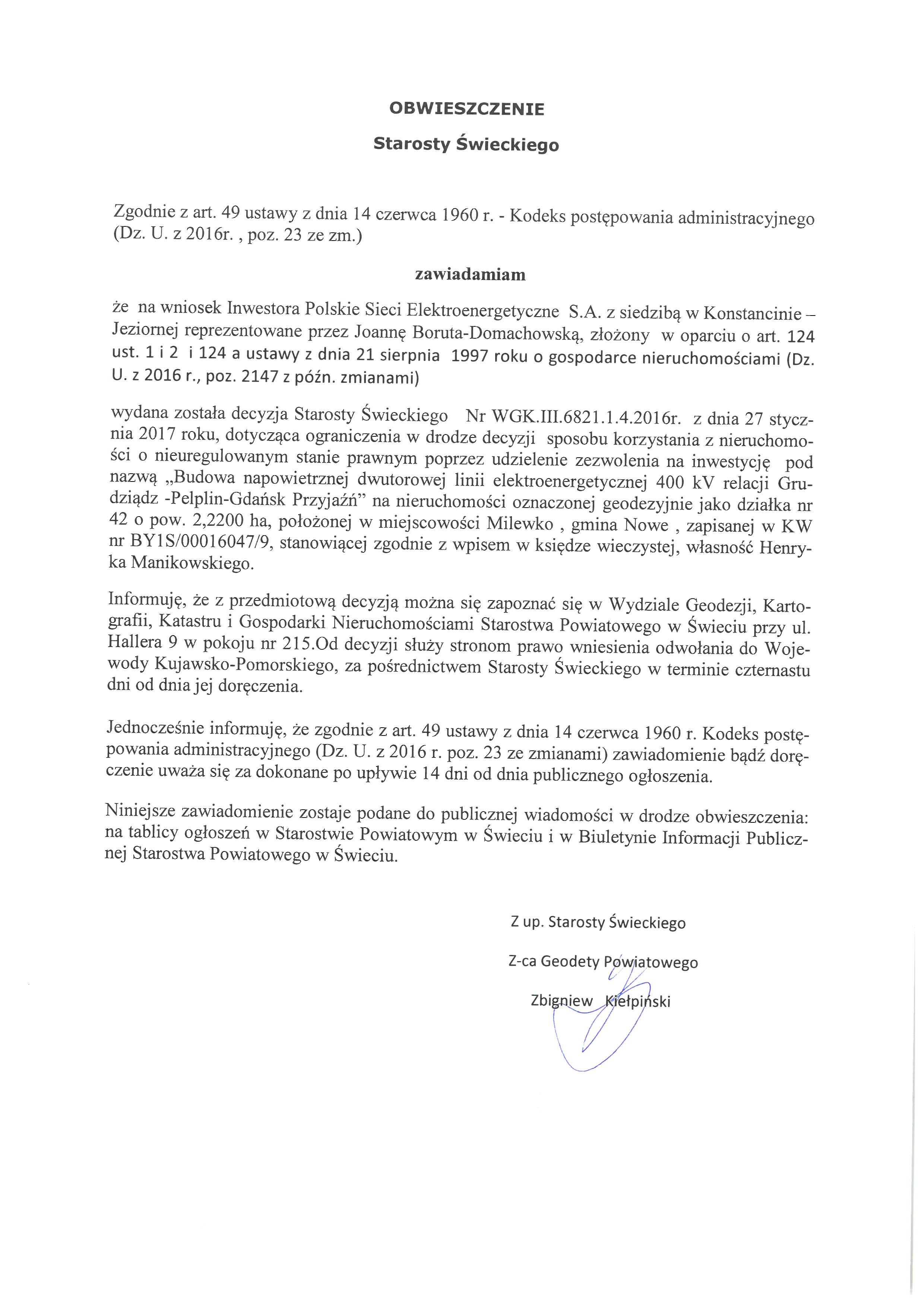 Zawiadamiam, że na wniosek Inwestora Polskie Sieci Elektroenergetyczne S.A. z siedzibą w Konstancinie –Jeziornej reprezentowane przez Joannę Boruta-Domachowską, złożony w oparciu o art. 124 ust. 1 i 2 i 124 a ustawy z dnia 21 sierpnia 1997 roku o gospodarce nieruchomościami (Dz. U. z 2016 r., poz. 2147 z późn. zmianami) wydana została decyzja Starosty Świeckiego Nr WGK.III.6821.1.4.2016r. z dnia 27 stycznia 2017 roku, dotycząca ograniczenia w drodze decyzji sposobu korzystania z nieruchomości o nieuregulowanym stanie prawnym poprzez udzielenie zezwolenia na inwestycję pod nazwą „Budowa napowietrznej dwutorowej linii elektroenergetycznej 400 kV relacji Grudziądz -Pelplin-Gdańsk Przyjaźń” na nieruchomości oznaczonej geodezyjnie jako działka nr 42 o pow. 2,2200 ha, położonej w miejscowości Milewko , gmina Nowe , zapisanej w KW nr BY1S/00016047/9, stanowiącej zgodnie z wpisem w księdze wieczystej, własność Henryka Manikowskiego.